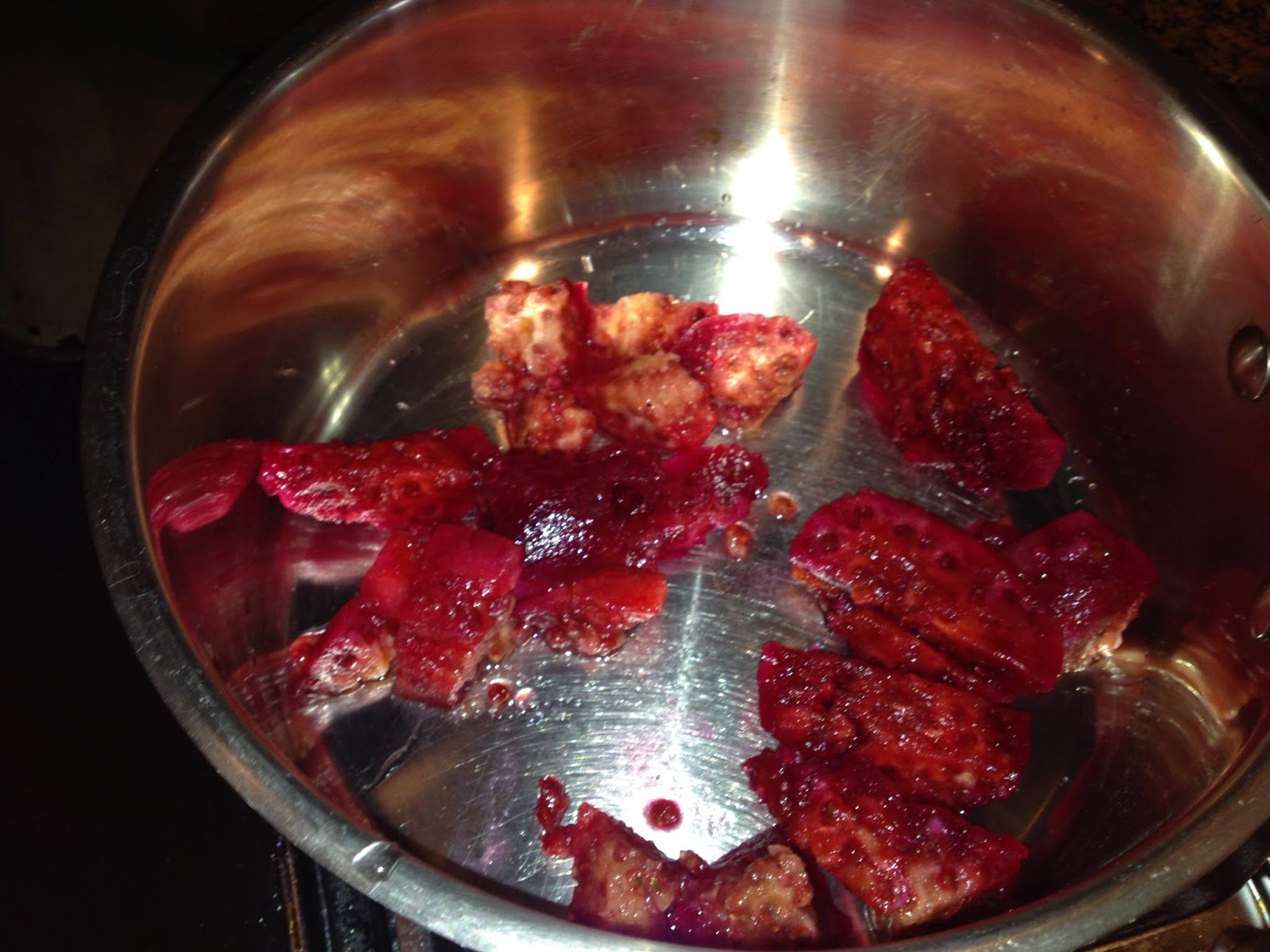Prickly pears grow off a cactus and can be covered in spikes. There were two types I found, white and red. To eat it, I cut the ends off and made a slice down. The skin is thick but you can peel it off. When I tasted it raw, I liked it but the seeds make it tough to eat. I decided to make a prickly pear sauce.